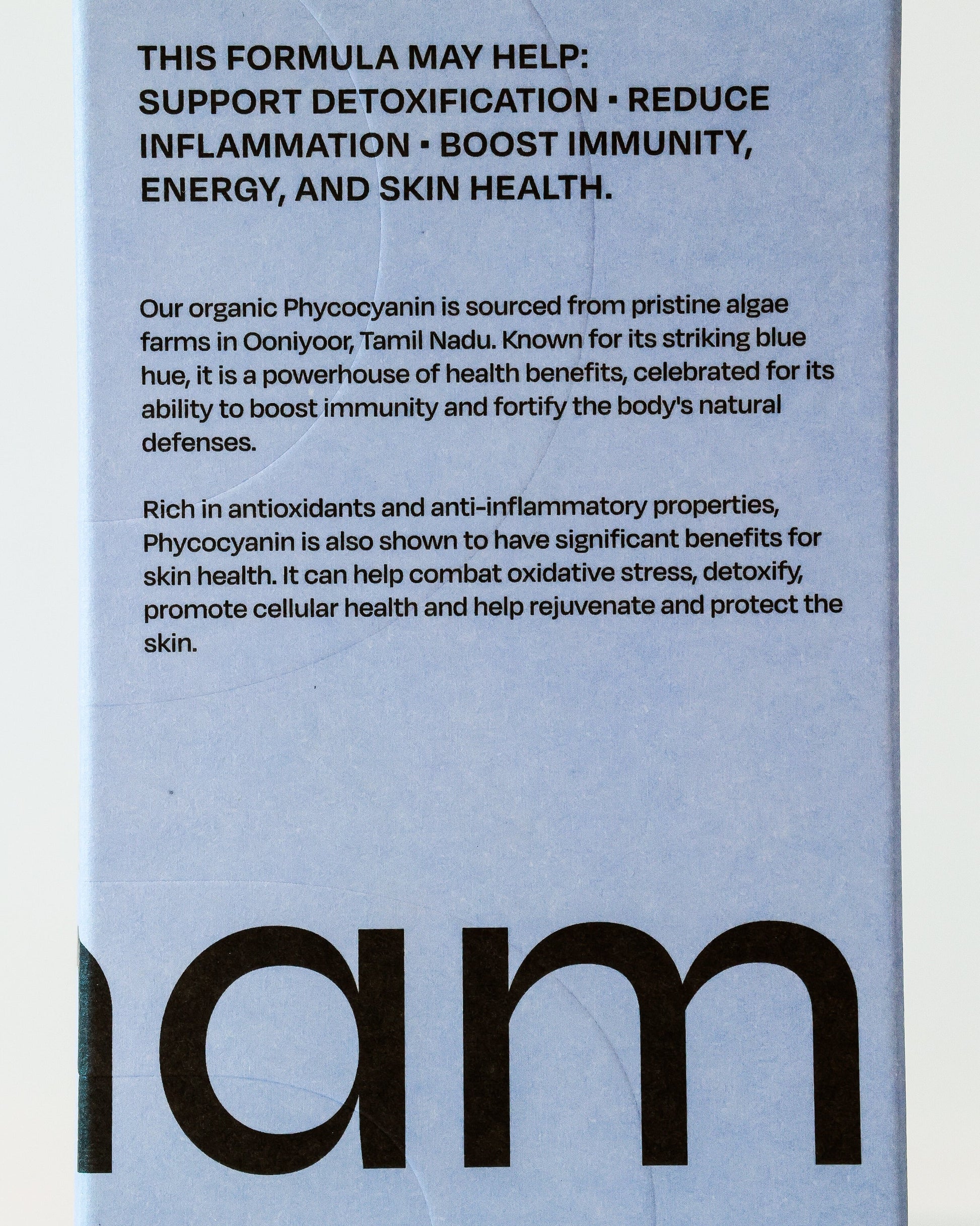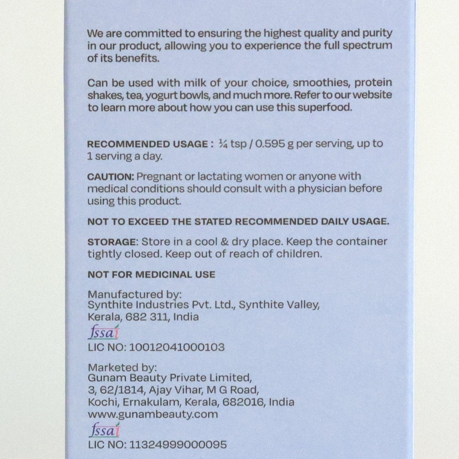 Known for its striking hue, Blue Spirulina (Phycocyanin) is rich in antioxidants, protein, essential fatty acids, vitamins B, C, E, K, iron, manganese, potassium, folate, and amino acids for improved well-being(1). Our organic Phycocyanin is vegan and sourced from pristine farms in Ooniyoor, Tamil Nadu.