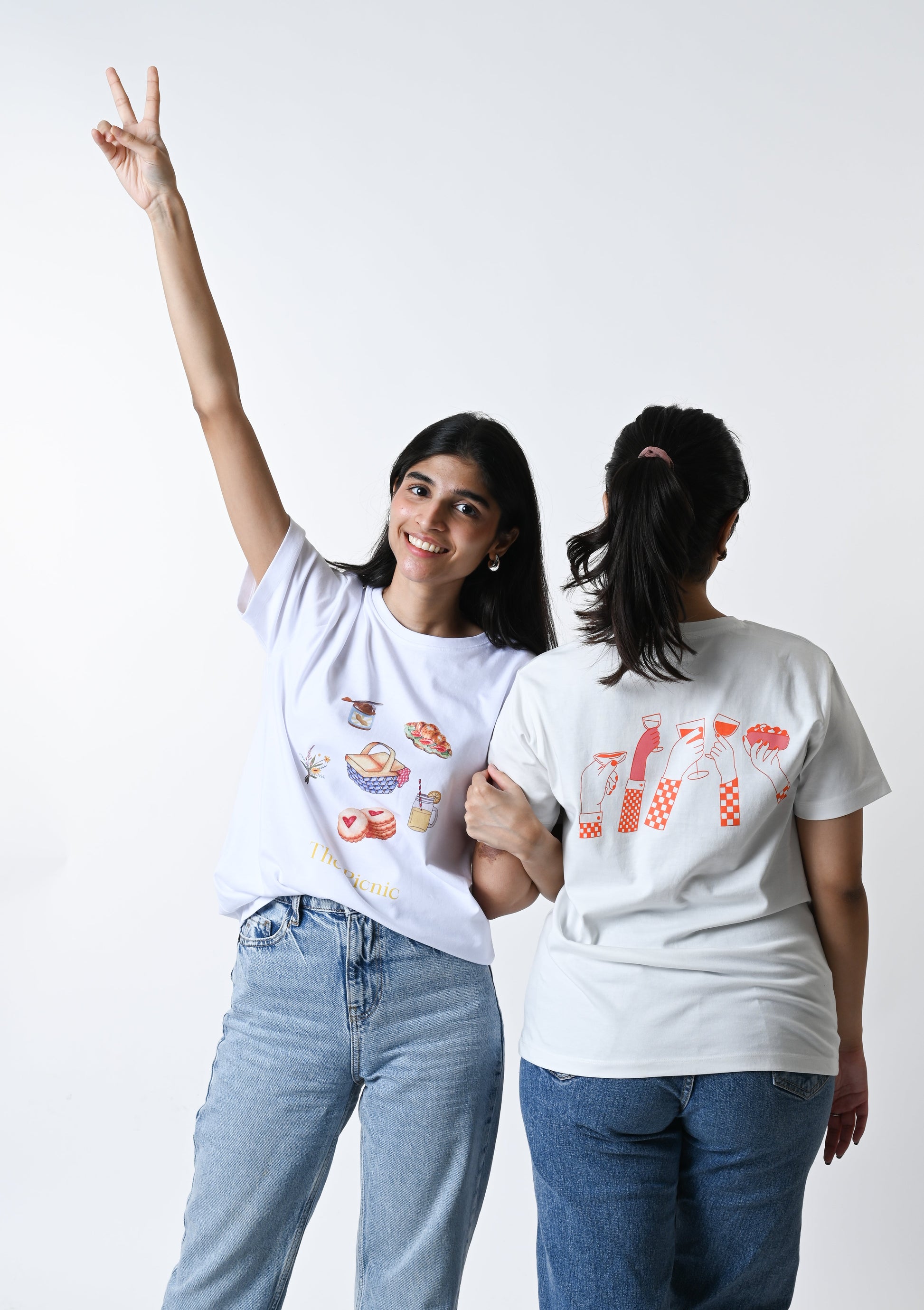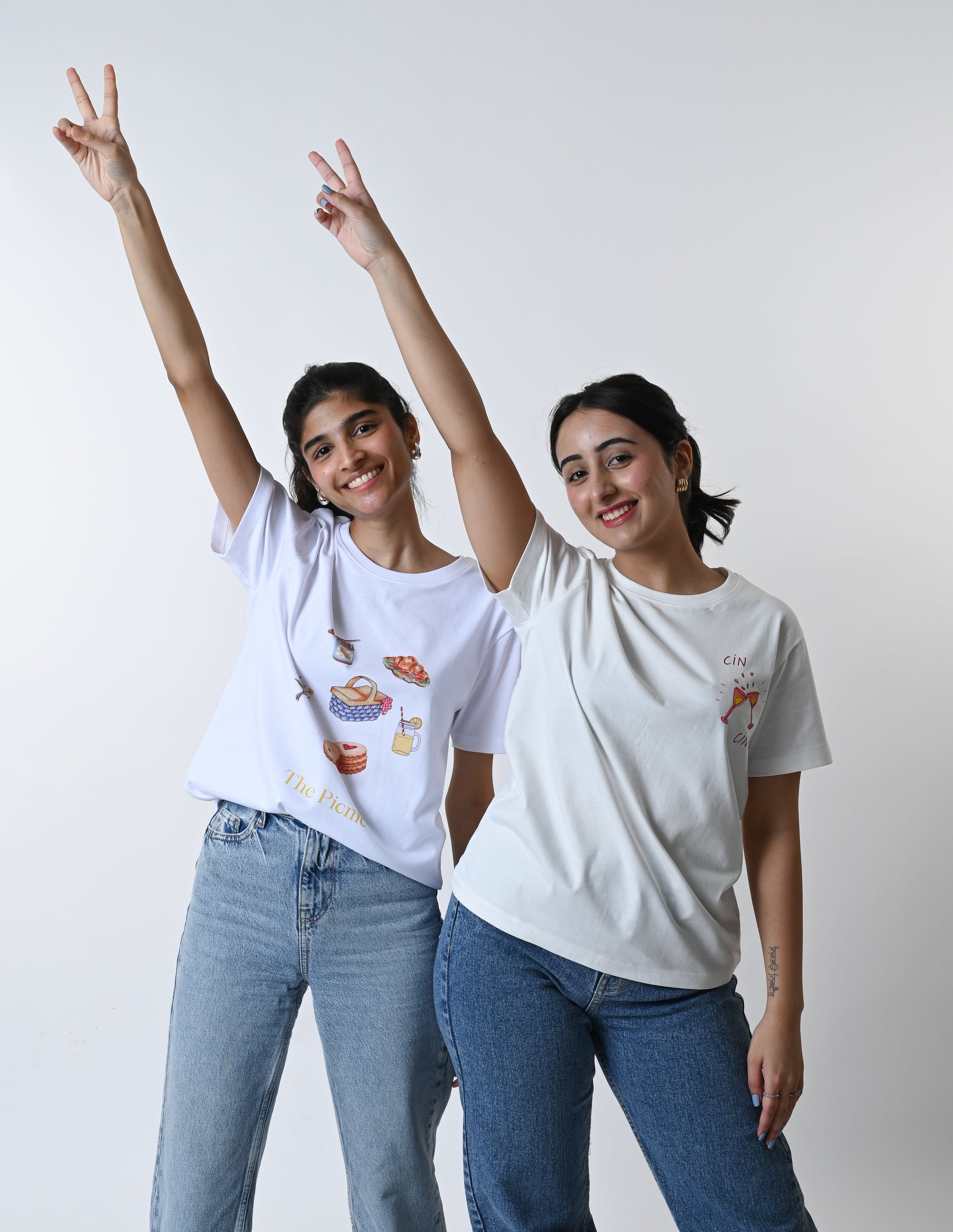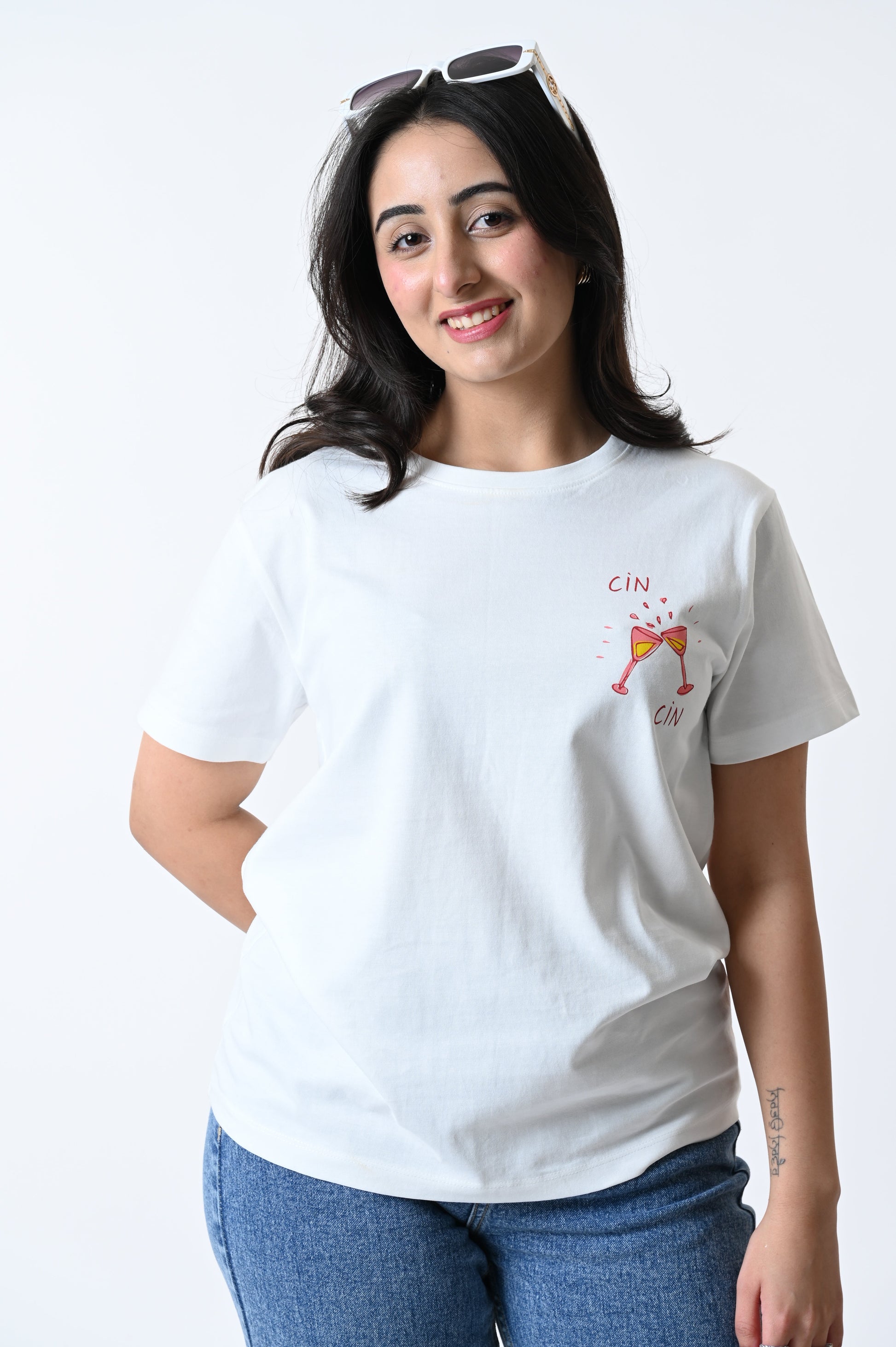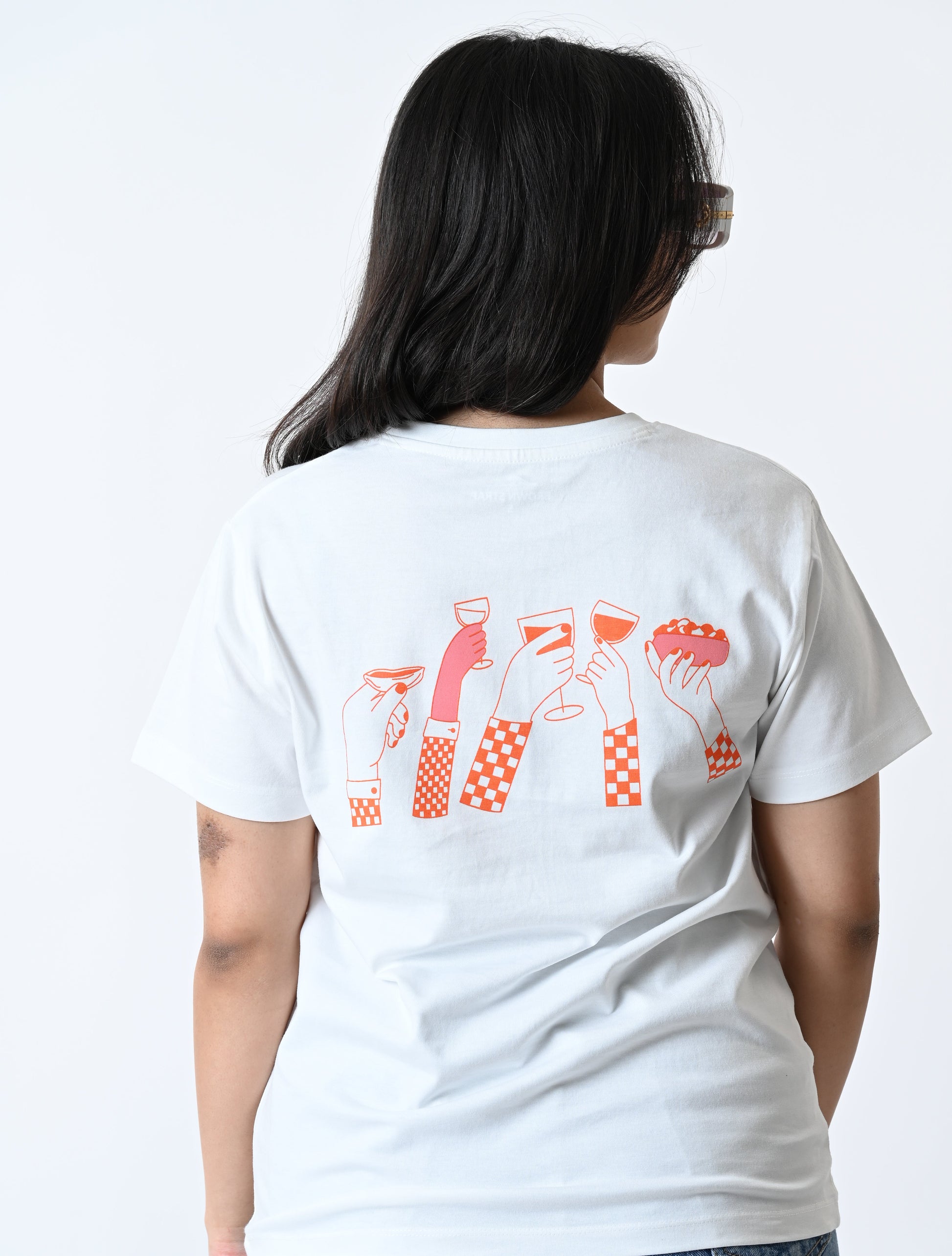 Our Cin Cin T-shirt has been printed using Water-based Ink print, making it sustainable as it is non-hazardous with a lower carbon footprint It features a print on the front of the t-shirt near the pocket and on the back of the t-shirt.