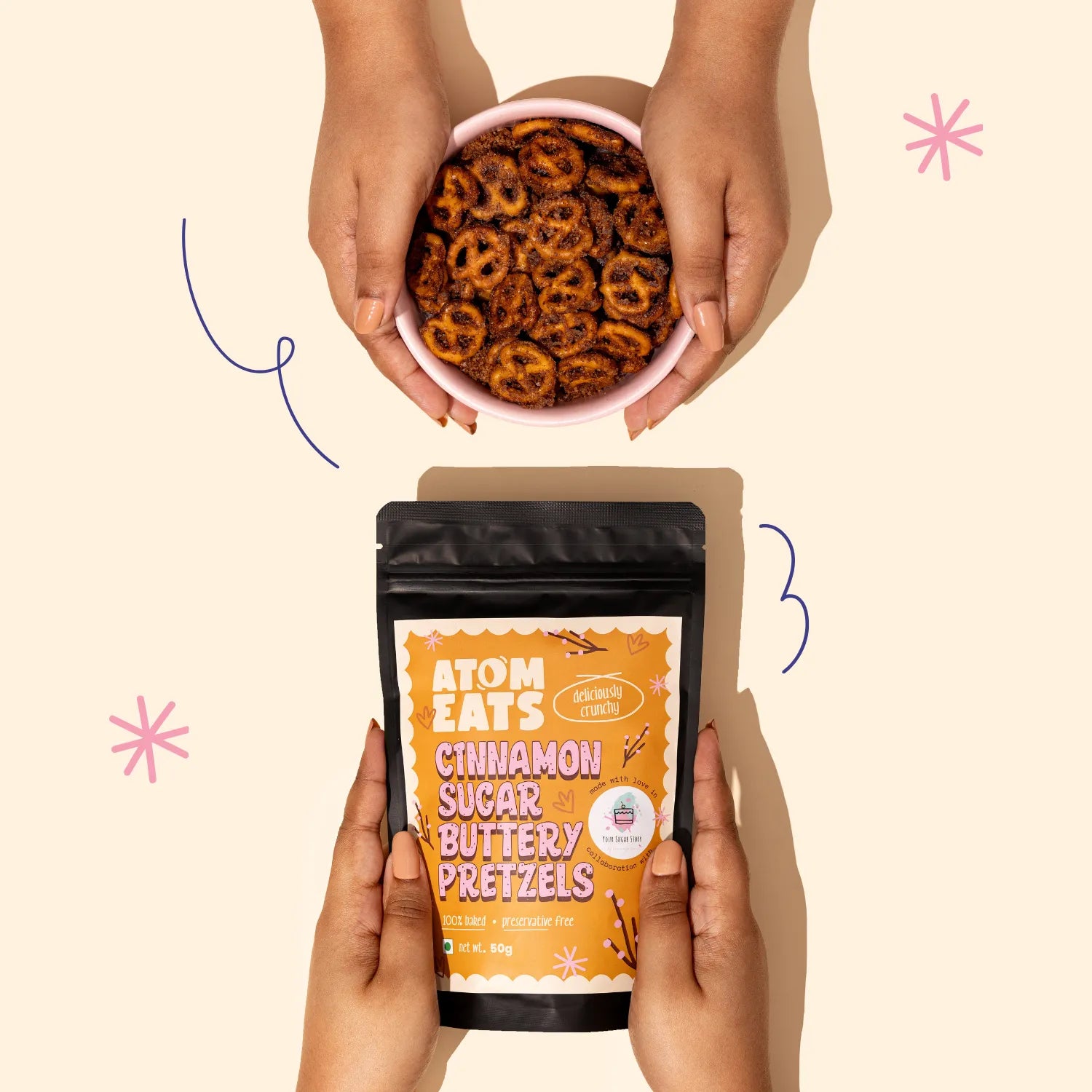 Indulgent Flavour Profile: Our pretzels offer a harmonious blend of sweet and savory flavours, with a rich buttery base complemented by a sprinkle of warm cinnamon and sweet sugar.
