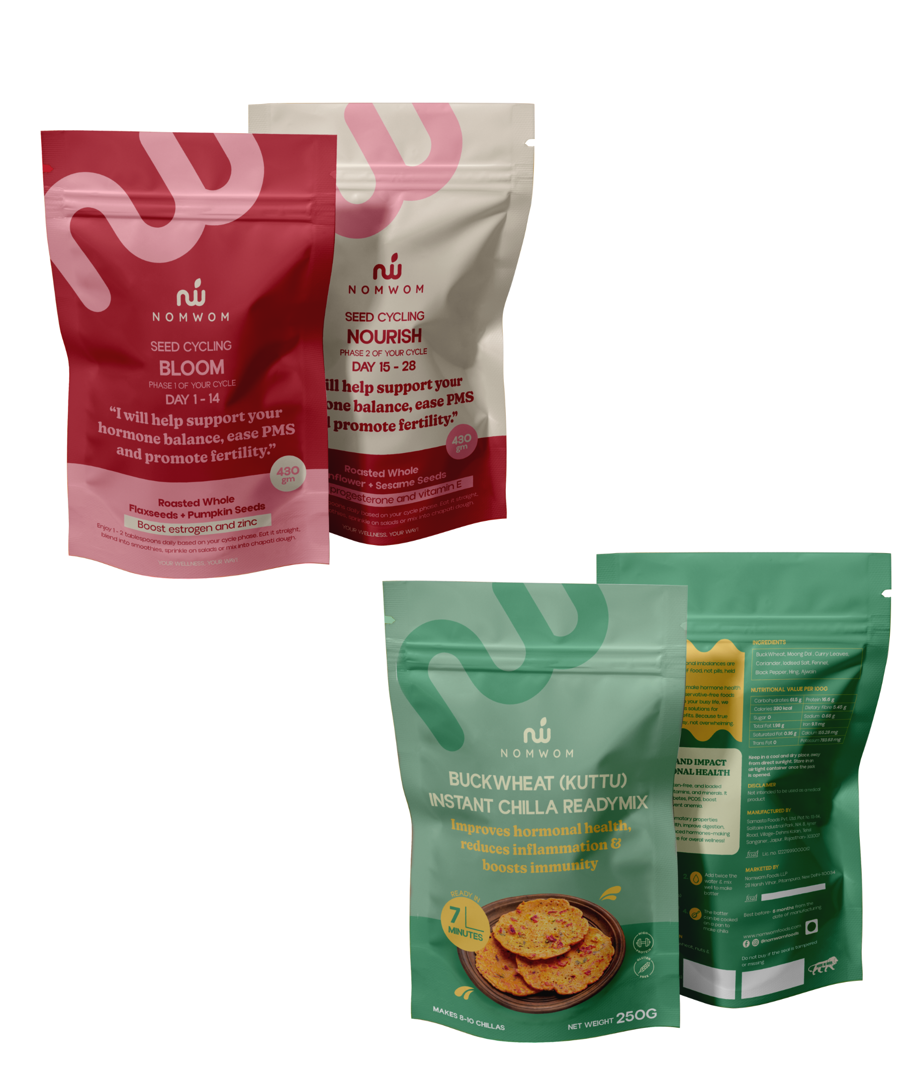 The Cycle Support Bundle is your daily support system for better hormonal health. The nutrient-dense Seed Cycling Pack supports your body through every phase of your cycle, while the Buckwheat Instant Chilla Mix provides clean, hormone-friendly nourishment. Together, they help ease PMS, boost energy, and keep your gut and hormones in balance — naturally.