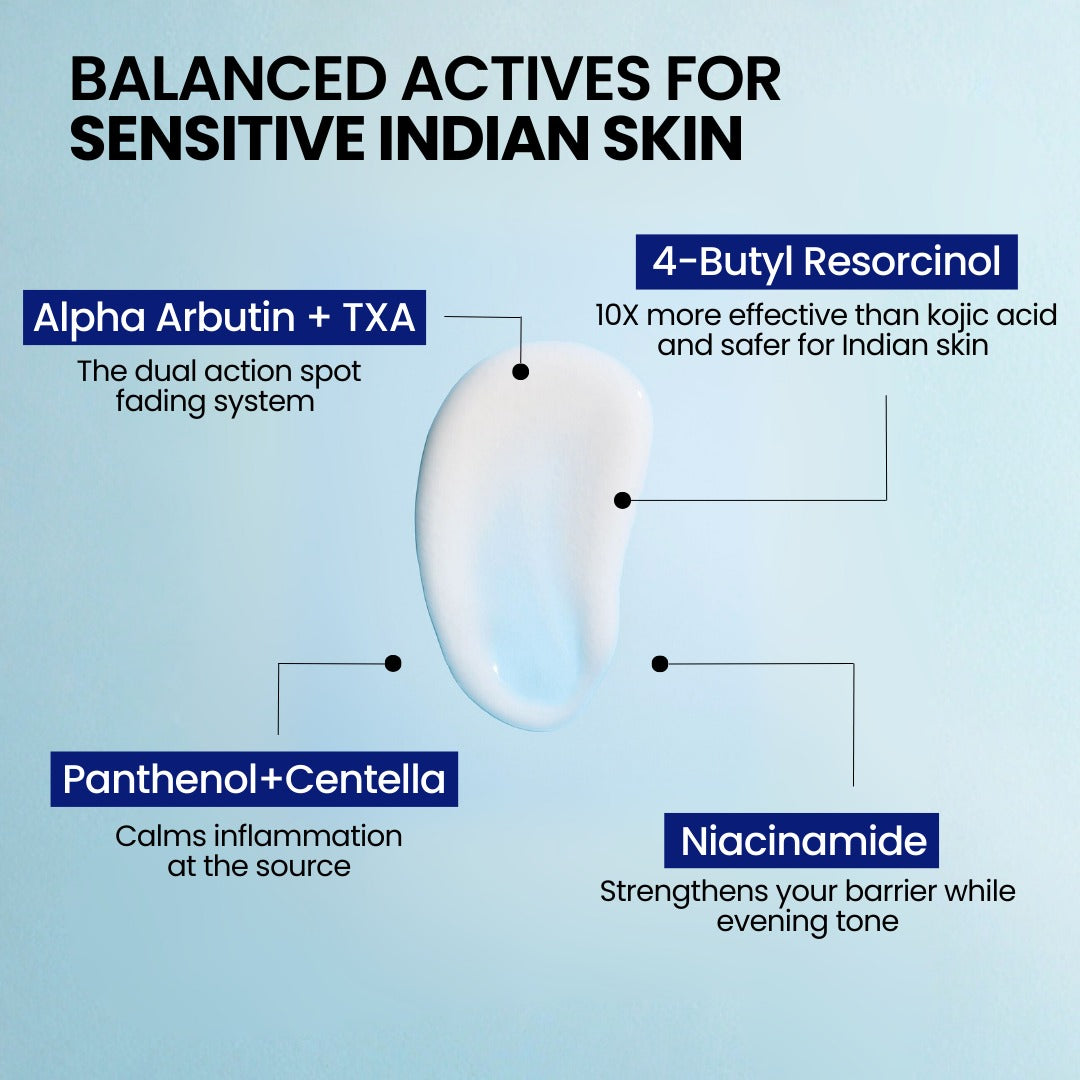 Designed for Indian skin biology and clinically tested across 36 Indian skin tones, this fragrance-free milky serum fades dark spots in just 3 weeks while strengthening the skin barrier. Gentle, non-greasy, and suitable for sensitive, melanin-rich skin.