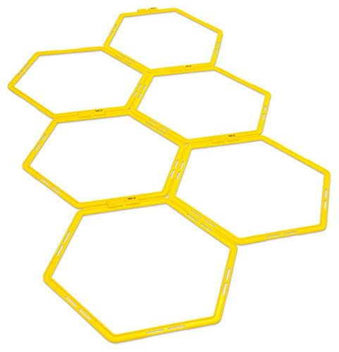 The SKLZ Speed Web was designed to improve footwork, agility, and explosive movements with six customizable hexagonal rings. Configure the web in a variety of speed ladder patterns or hurdle patterns with easy-to-connect clips. The Speed Web is designed to be placed in a variety of training patterns so that athletes can focus on quick-feet during training. Their unique design allows the pieces to stand up vertically together for a hurdle-like position to work on explosive, upward agility exercises. The hexagons can also be separated for individual skill work targets for various sports. Their durable build allows for use on most surfaces, including grass, turf and tracks. The SKLZ Speed Web is compact enough to fold up and store or transport anywhere. This kit includes six hexagonal rings that weigh a total of approximately 2 lbs. Each ring is 19.69 inches in height by 22.36 inches in length and 2.76 inches in width. The rings are yellow in color.