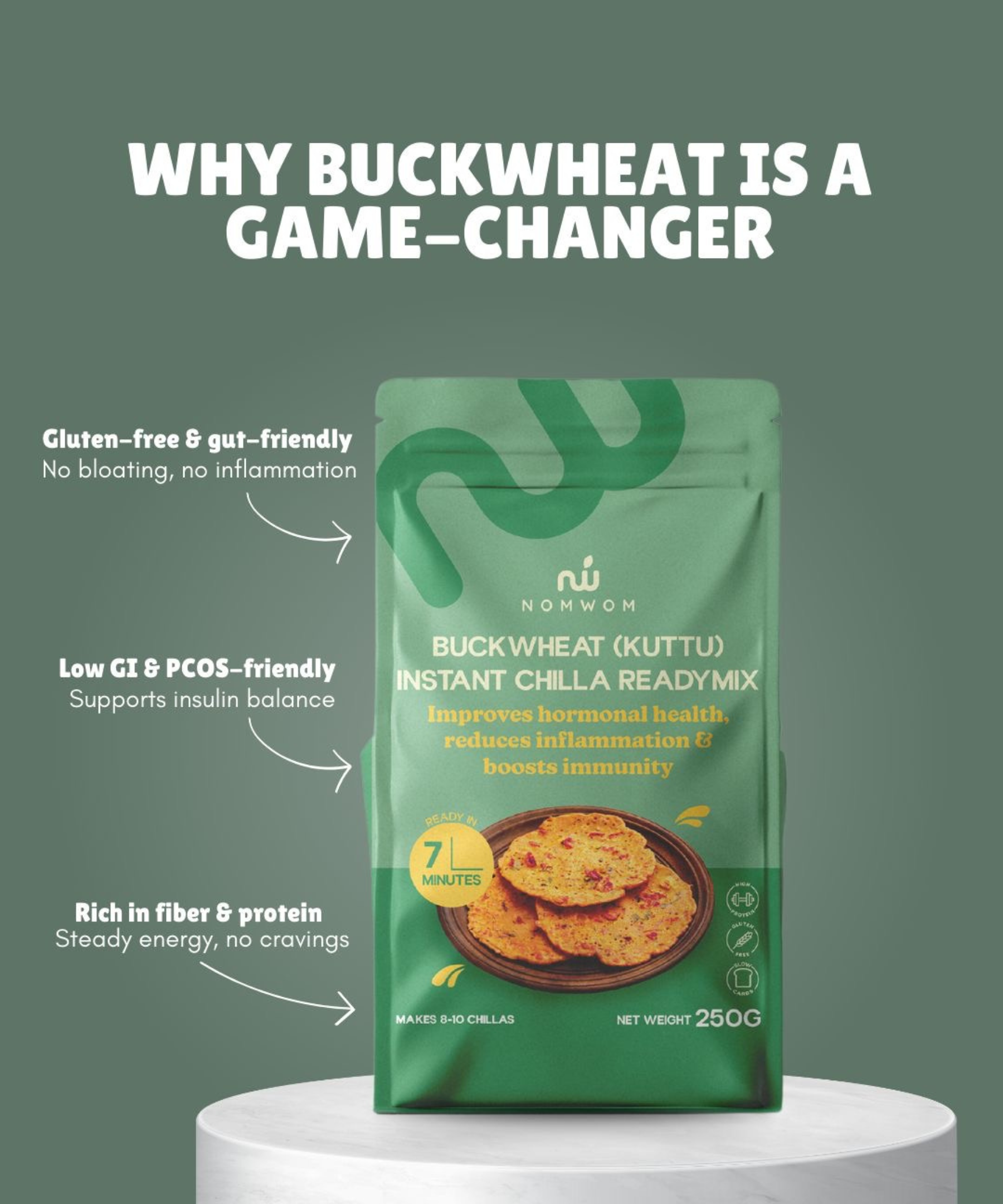 Buckwheat Instant Chilla Readymix: A delicious, quick-to-make, hormone-friendly meal with no preservatives—ready in just 7 minutes. Fuel your day with clean ingredients and powerful nutrition, one savory bite at a time.